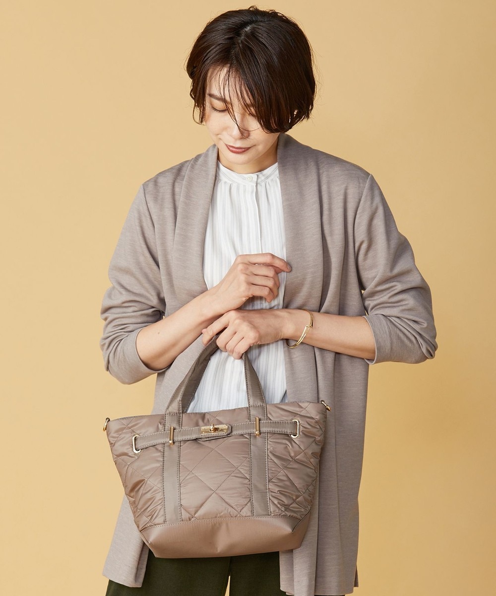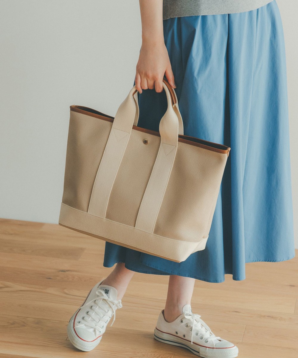 ベージュのバッグは、柔らかな雰囲気で、ナチュラルな印象を与えます。