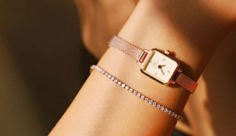 テニスブレスレットの楽しみ方のひとつに「重ね付け」があります。華奢で主張しすぎないデザインなら、手持ちの腕時計やシンプルなバングルとも相性抜群。